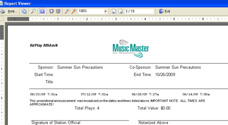 You’ll get a report for each sponsored element and the dates/hours they aired in. Note a value can also be assigned in the database to each as needed. There is also a print box icon that can be selected in the upper left hand corner.