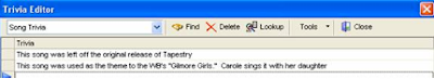 From the menu at the top, select Dataset-Library-Trivia this takes you to the trivia editor for artist and Title. This is the global trivia editor. It allows you to look at song trivia or keyword trivia. The Lookup button will show you what songs or keywords use the line of trivia. The Tools Option contains options to show usage counts for the trivia lines, print the trivia, removed expired trivia and purge unused trivia.
