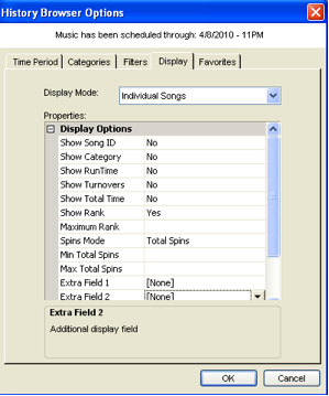 Display – This is where you’ll set up the report. In the Display Mode, we suggest selecting Individual Songs. You can choose to include any of the other Properties listed. We would suggest at least “Show Rank.” Notice there are also Extra Fields so you can include other fields that you may want to see, for instance record label or automation number.