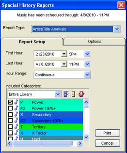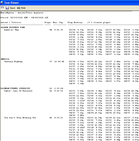 This is an excellent way to get a report of all specific plays by artist and the active titles from that artist in your database. Go to Dataset-Analysis-Special Library REPORTS and select Artist/Title Analysis.