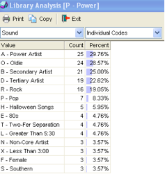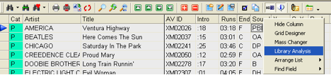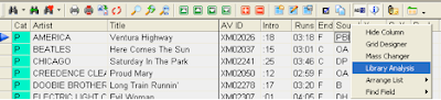 Trying to find out the percentage of “pop” coded songs in your active library or a specific category, or maybe the number of “slow” coded songs? Here’s a quick way to view that (and print it, if desired)Bring up your category or query of songs in library maintenance and select the field you want to get more details about. In the example below, we’ve chosen the sound code. Right click over the grey field header and from the menu that pops up chose LIBRARY ANALYSIS.