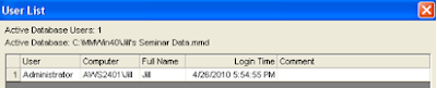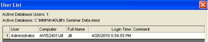 Helpful if your database resides on the network and there are many instances of MusicMaster in multiple locations throughout your facility. Go to Tools-User List.