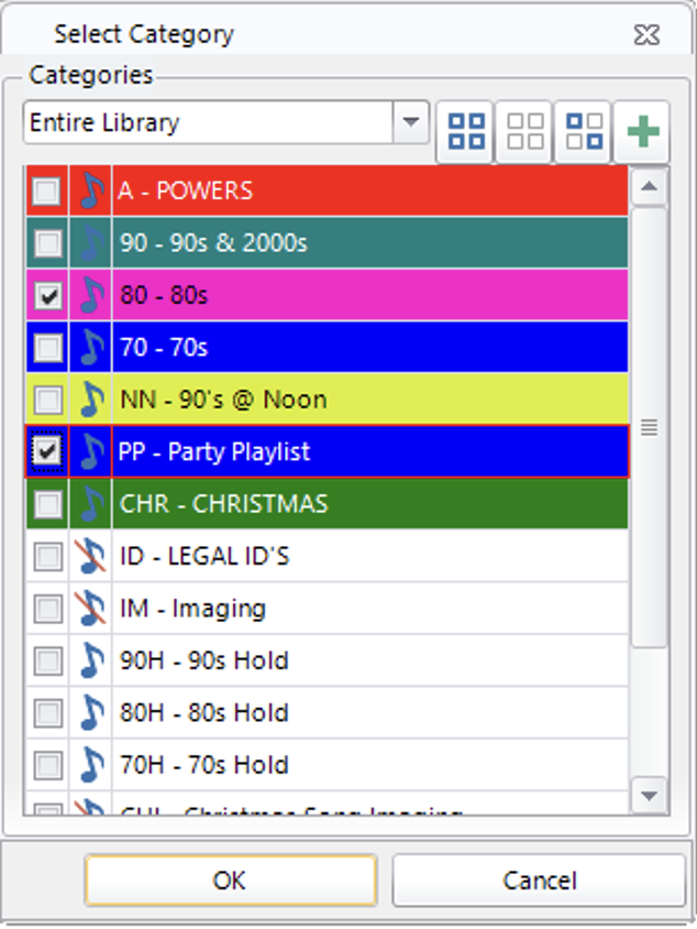 In this case, I’m looking for “Summer” songs for a bit I’m doing for a weekend show. The songs in gray are songs that already exist in the station. White songs are not currently in the station. I’ll select two more songs (seen here in gold) that are in Enterprise for my purposes.