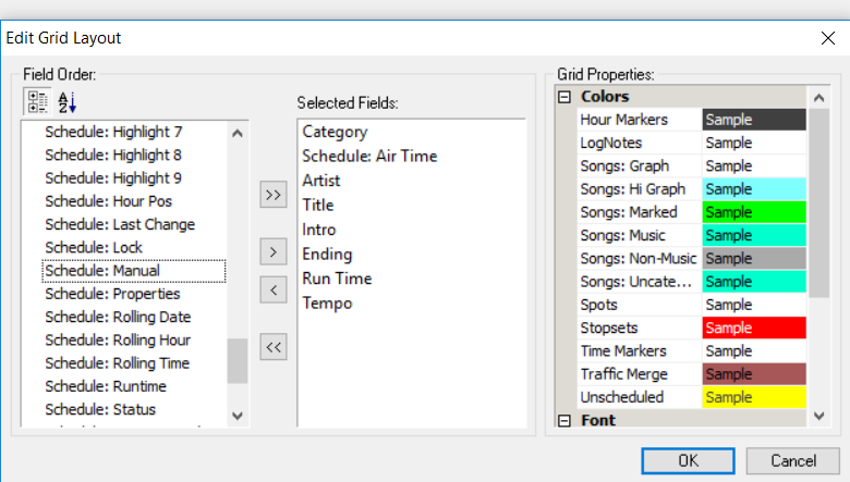 It turns out there was an available “User” field that I could use. You may have a Yes/No field you are not using and you can simply directly enter the name(type) into Name and abbreviation. If for any reason you do not have a  field available any of our Music Scheduling Consultants would be happy go  “Under the hood” and add one for you. It is as easy as sending us your data. I renamed the field “Artist Intros”. Now I open my Artist Liners category and add the new Yes/No field to my layout by clicking on the Show/Hide Fields icon, locating the field and dragging into my layout.