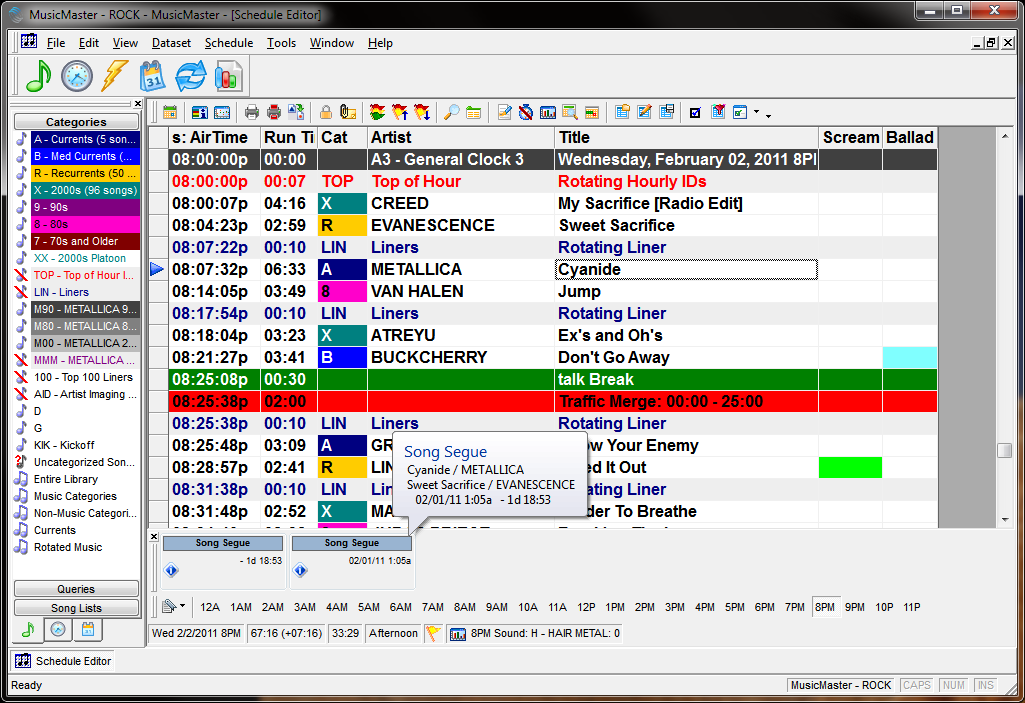 The Song Segue panels test any item scheduled from a MusicMaster category. So if we click on “Cyanide”, MusicMaster will tell us the last or next time it is playing next to “Rotating Liner”. However, we can tell MusicMaster to ignore items that are up to 15 seconds in length. This is done under Tools/Options/Additional Properties. Under the Schedule header you’ll find SegueGapTime. You can use a setting here from 0-15 which represents the length in seconds of items you wish the Segue panels to ignore. Once set, click Apply and OK and now when we click on “Cyanide”, MusicMaster will ignore the “Rotating Liner” and instead test against “Sweet Sacrifice” and present that data for us in the Song Segue panels. Please note, you’ll have to close and re-open the Schedule Editor for the adjustment to take hold.