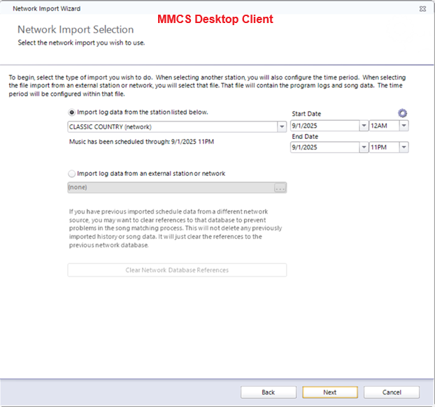 The next screen that appears will allow you to choose the station you want to import from and the dates/times you intend to import. Note, you can also choose to import from an external station or network that also uses MusicMaster but is not part of your company’s Enterprise.