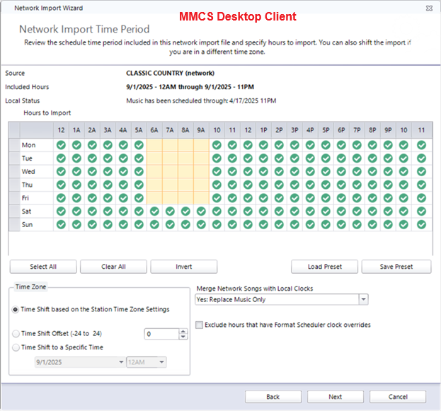 Click Next to get to the Network Import Time Period. Here you can skip hours you don’t want to import. In the images below we are skipping the network’s morning show so it can be scheduled locally. On this screen you can Time Shift if you wish, exclude hours that have overrides via the Format Scheduler, and determine how you want to merge the network songs with your local clocks.