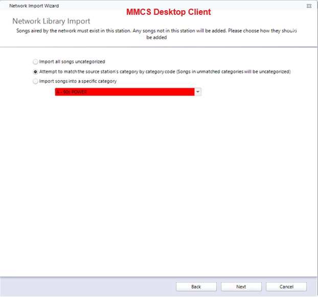 Once you have that configured, click Next to get to the Network Library Import. Here you indicate where you want the songs from the network/base station to go in your local/affiliate station. If the songs are in the same categories in the network and affiliate stations, I would recommend you “Attempt to match the source station’s category by category code.” This way songs that are in Category 1 in the network will also be in Category 1 in the affiliate. If you don’t want the network songs to match up with those already in your station, you can “Import all songs uncategorized.” Your third option is to “Import songs into a specific category” that you can specify.