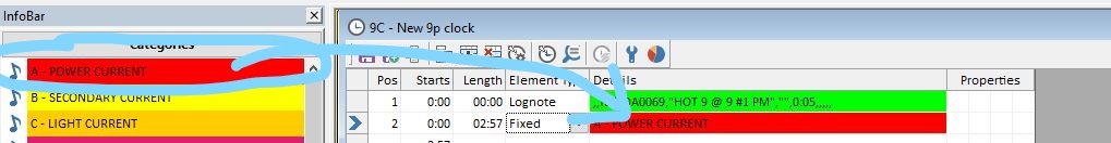 You can also drag in lognotes. those commands for your playback system that you so carefully typed into your clocks are all retained under the clock tab at the bottom of the Info Bar. Click on the Clock tab, then select the ‘Lognotes’ header. There is your entire list of carefully created lognotes. You can drag and drop those into your clocks, too! No sense in having to type them all out again.