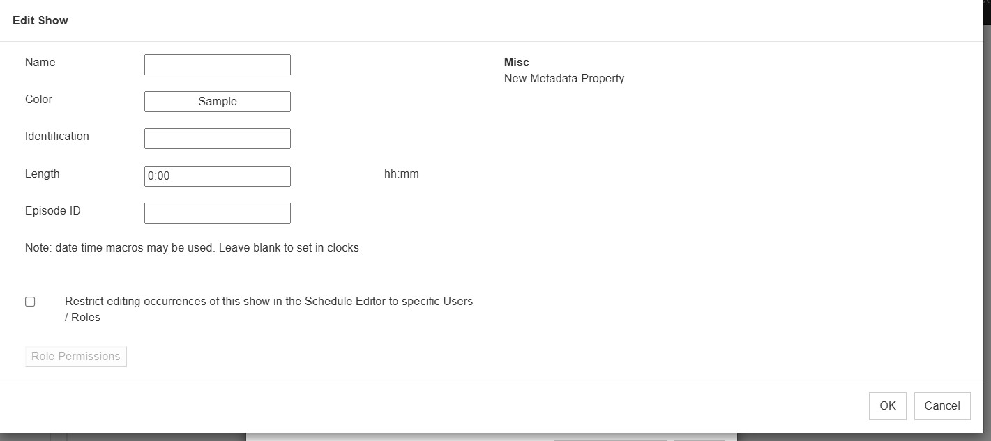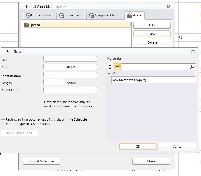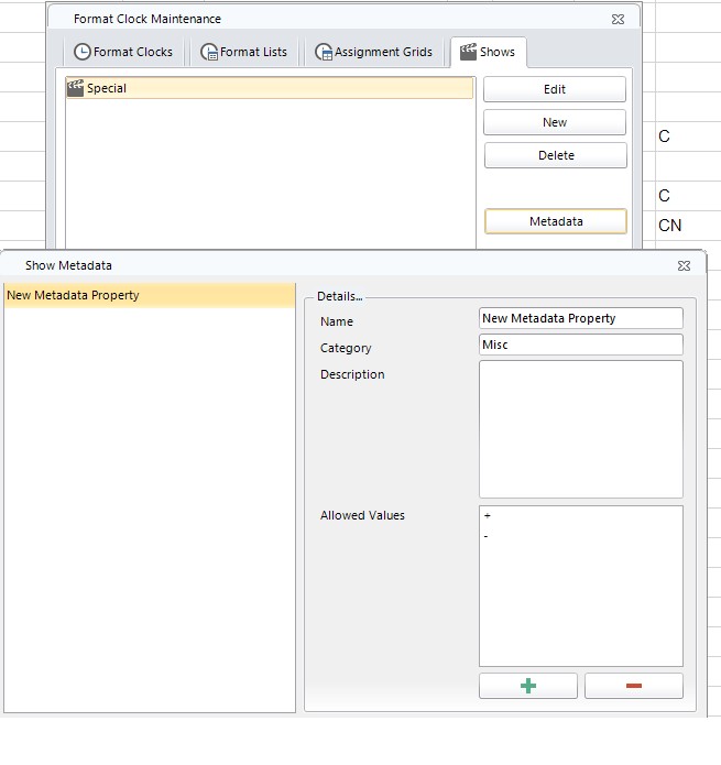 To create Metadata, go to the Shows page in Format Clock Maintenance. At the bottom left, use the add or delete buttons to manage your Metadata items. On the right, you can enter the specifics: