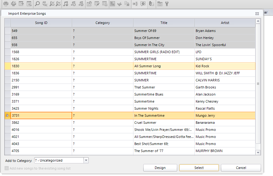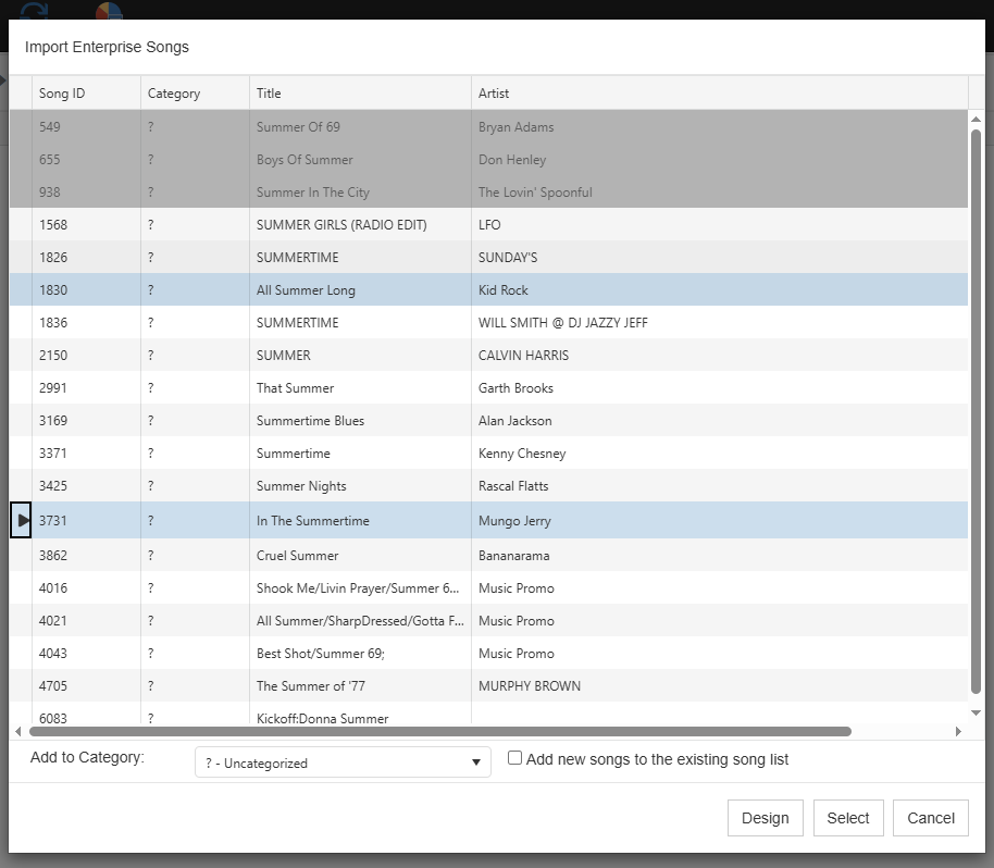 In this case, I’m looking for “Summer” songs for a bit I’m doing for a weekend show. The songs in gray are songs that already exist in the station. White songs are not currently in the station. I’ll select two more songs (seen here in gold) that are in Enterprise for my purposes.