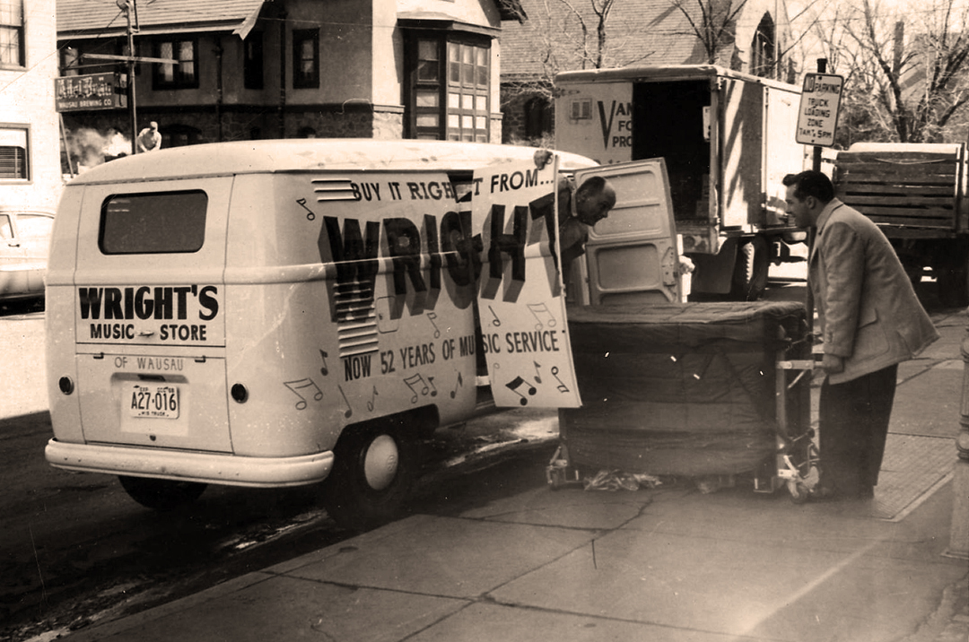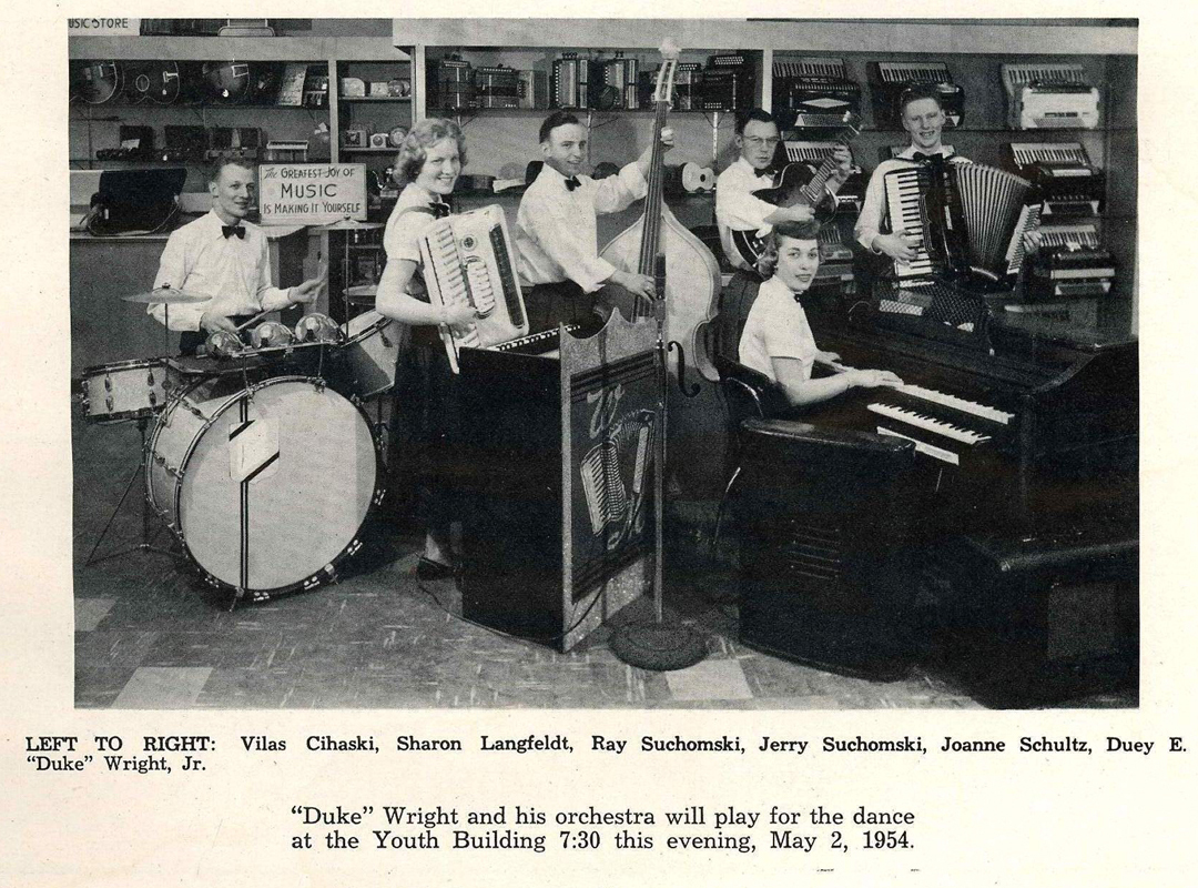 Duke’s parents, Duey Sr. and Julia Wright, owned Wright’s Music Store in Wausau, Wisconsin. Duey Sr. had carried on the legacy from his own father, Hervey, who built the first Wright’s Music Store in Marshfield, WI. Duey Sr. operated that store until 1928 before moving to Wausau and opening the store there. Wright’s Music Store offered everything from radios, jukeboxes and TVs, to musical instruments and lessons.